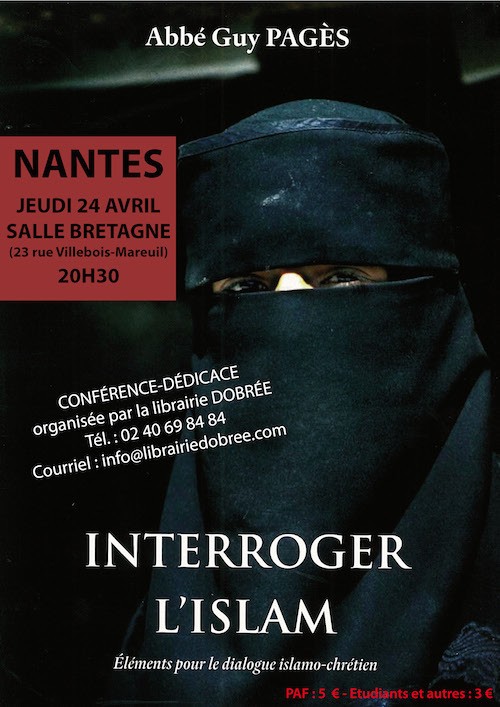 L’abbé Guy Pagès donnera une conférence à Nantes le 24 avril prochain sur son dernier livre: « Interroger l’Islam, éléments pour le dialogue islamo-chrétien ».