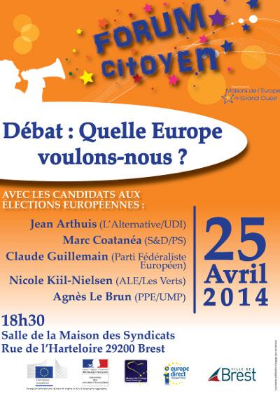 21/02/2014 ‑ 08H00 Brest (Breizh-info.com) –À un mois des élections européennes du 25 mai 2014 la Maison de l’Europe de Brest organise un grand débat : « Quelle Europe voulons-nous ? » avec une partie des candidats aux élections européennes de la circonscription Ouest :