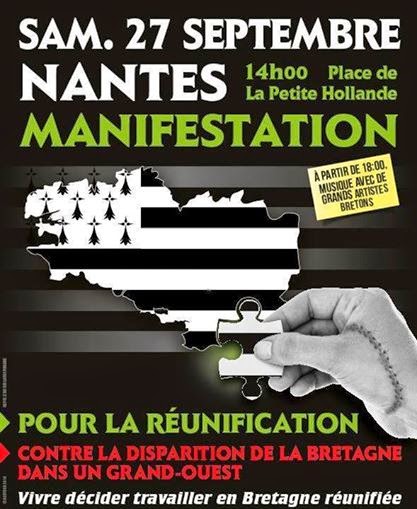 Il faut au moins 50.000 personnes le 27 septembre, pour que la donne puisse changer, c’est à dire sortir du statuquo. En seconde lecture il est illusoire de croire que la réunification de la Bretagne se fera. La seule possibilité est d’obtenir la fusion Centre-Pays de Loire à court terme pour en exfiltrer d’ici 2017 la Loire-Atlantique en Bretagne (et la Vendée vers l’Aquitaine-Poitou).