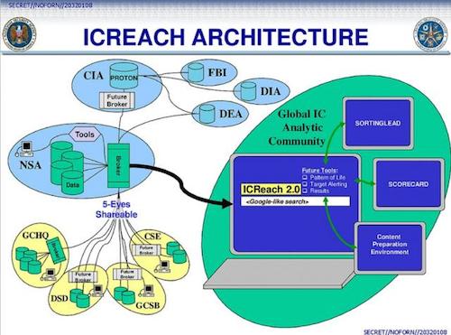 D’après les documents fuités et l’analyse de Gallagher, le moteur de recherche ICREACH créé par la NSA permet aux analystes de près de deux douzaines d’agences gouvernementales, incluant le FBI et la DEA (Drug Enforcement Administration), parmi d’autres, de partager un vaste domaine de détails sensibles collectés par la communauté du renseignement et ses partenaires ne concernant pas seulement des suspects de terrorisme, mais « des millions et des millions de données au sujet des citoyens américains, qui n’ont été accusés d’aucun crime ni délit », écrit Gallagher.