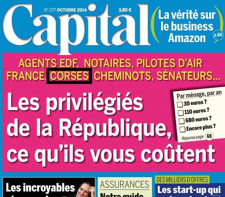 15/10/2014 – 14H30 Bastia (Breizh-info.com) – « Agents EDF, Pilotes d’Air France, Cheminots, Africains, Notaires, Sénateurs : les privilégiés de la République – ce qu’ils vous coûtent ». Imaginez ce titre en une d’un mensuel subventionné et en vente chez tous les marchands de journaux. Un beau scandale politique en vue, non ? Et bien remplacez le mot « Africains » par le mot « Corses », et vous avez la une du mois d’Octobre du mensuel Capital, qui entend dénoncer les « privilégiés de la République ».