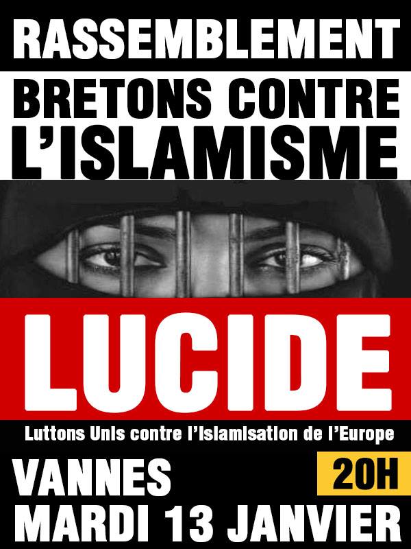 10/01/2015 – 07H00 Vannes (Breizh-info.com) – Le collectif LUCIDE, «luttons unis contre l’islamisation de l’Europe» – qui semble être une émanation de PEGIDA en Allemagne, organise un rassemblement à Vannes, mardi 13 janvier à 20h. Ce rassemblement «contre l’islamisme» entend se démarquer des manifestations qui ont eu lieu pour protester contre l’attentat perpétré contre Charlie Hebdo. Celles-ci ont pris en effet le soin de ne désigner aucun responsable.