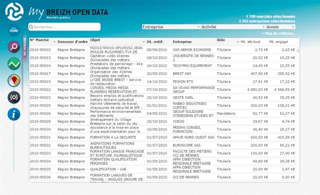 Ce projet se concrétise avec la mise en ligne d’un prototype, développé à partir des informations du Conseil régional sur 2013, 2014 et 2015. Pour le donneur d’ordre public, l’intérêt est de montrer l’exemple et d’inciter l’ensemble des acheteurs publics à mettre à disposition leurs données, au profit du développement de l’économie bretonne.