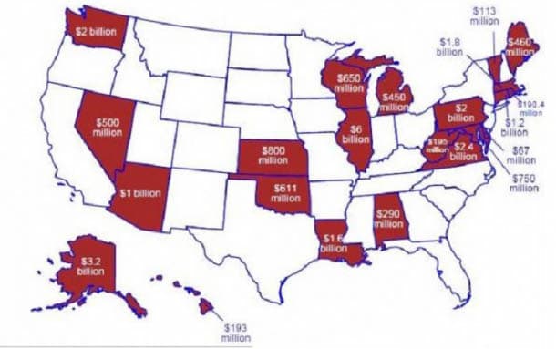 Selon les données de l’agence de presse, 22 Etats sur les 50 de l’Union s’attendent à un déficit budgétaire en 2015, qui se chiffrera en centaines de millions voire en milliards (billions) de dollars. Parmi les plus endettés, l’Ilinois (6 milliards de £ de déficit prévu), l’Alaska (3.2 milliards de dollars de déficit prévu), l’état de Washington au nord-ouest du pays (2 milliards de $), la Virginie (2.4 milliards de $), la Pennsylvanie (2 milliards de $), le Massachusetts (1.8 milliard de $), la Louisiane (1.6 milliards de $), le Connecticut (1.2 milliards de $) et l’Arizona (1 milliard de $).