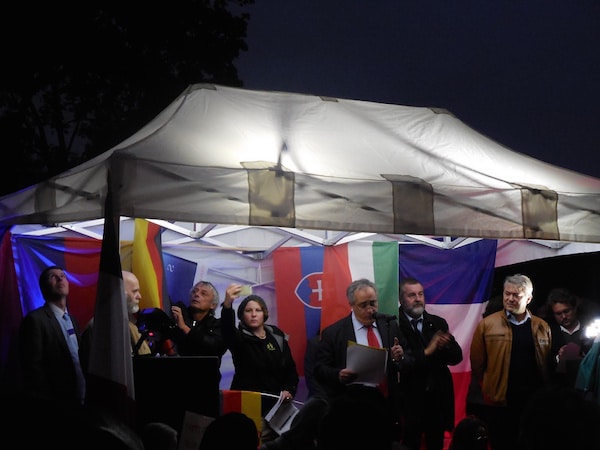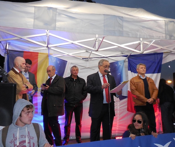 A la tribune, Karim Ouchikh fustigeait « ces 24.000 réfugiés [que la France s’est engagée à accueillir en deux ans] qui seront bientôt des centaines de milliers » et dont « la plupart rejoignent l’UE pour des raisons économiques. Cette Europe qui est l’Eldorado, le ventre mou de l’Occident et qu’il faut occuper en profitant de son impotence ». Au cours de son – long – discours émaillé de références identitaires, de « l’héritage charnel » aux « quartiers de noblesse patriotiques » en passant par le « défi identitaire » posé par la crise migratoire, les mentions du patronat – supposé vouloir des immigrés pour pousser les salaires à la baisse – mais aussi de Hollande, Merkel, Sarkozy et surtout BHL sont hués par la foule. En revanche les médias patriotiques indépendants – auxquels les organisateurs ont rendu hommage – la résistance de la Hongrie et le nom de Poutine sont acclamés. Dans la mesure où une partie notable des participants sont des nationalistes endurcis, qui aurait pu imaginer il y a encore dix ans qu’ils manifesteraient un jour contre la politique du gouvernement allemand et soutiendraient un président russe ?