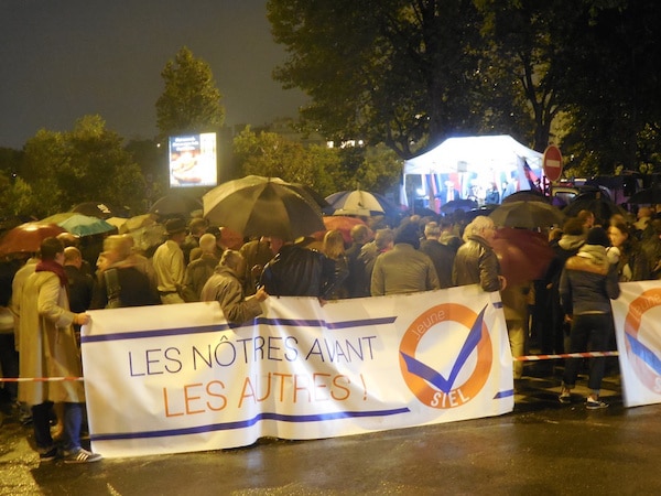 Parmi les nombreux manifestants qui se pressent sous leurs parapluies – une fois la nuit tombée, le crachin a nettement forci – Amicie est venue pour « lutter contre le grand remplacement et l’absurdité des frontières ouvertes ». Antoine, qui l’accompagne, craint que « les 24.000 réfugiés ne deviennent 240.000 puis pourquoi pas 24.000.000 grâce au regroupement familial ». Cet entrepreneur dans le secteur financier estime que la France a « une politique du travail d’un absurde qui confine au désastreux. On marche sur la tête en faisant venir des gens d’ailleurs alors qu’on a des millions de chômeurs ». En plus, cette crise migratoire s’inscrit « dans un contexte de tensions générales dues notamment à la crise. Mais même s’il y avait 5% de croissance, je serai contre leur arrivée ».