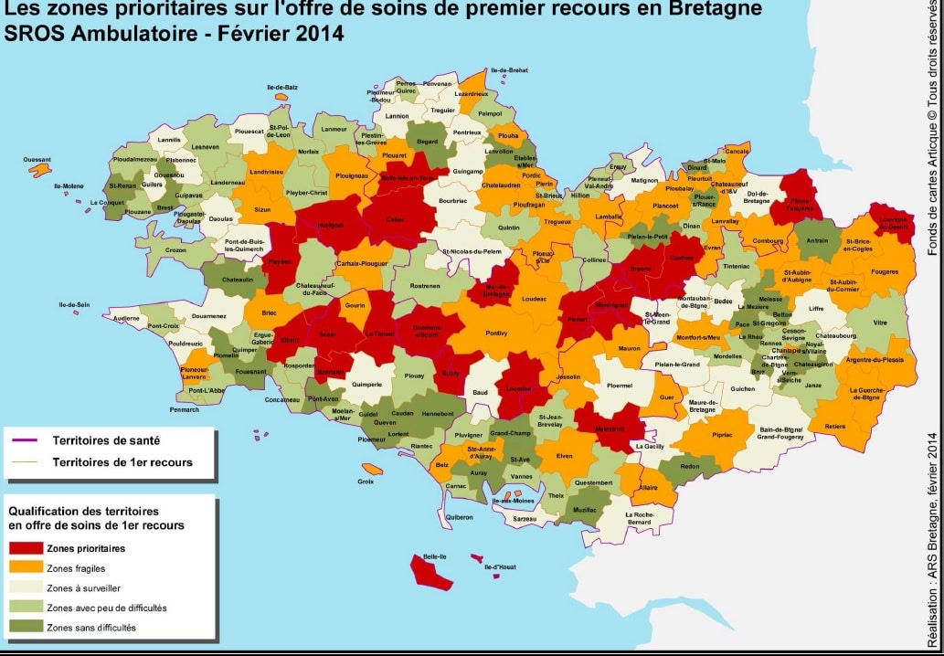 En 2014, 25 territoires bretons sur le continent connaissaient un manque très important de médecins par rapport aux moyennes nationales et étaient classés en zone prioritaire, comme on peut le voir sur la carte. Sur ces territoires vivent 173 128 habitants, soit 5.45% de la population de la Bretagne administrative suivant le recensement INSEE de 2009 et 3,9% de la population de la Bretagne historique. La quasi-totalité d’entre eux se trouvent dans le Centre-Bretagne. L’installation des médecins en zone prioritaire permet le déblocage de nombreuses aides, qui peuvent notamment être attribuées aux étudiants en médecine ou aux professionnels déjà installés, ainsi que des exonérations d’impôt, des mises à dispositions de locaux et de logements par les collectivités et une majoration incitative des honoraires.