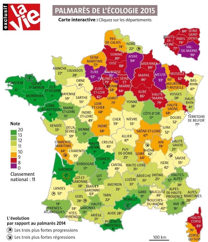 Du côté de la transition énergétique, trois départements bretons sur cinq sont à la 15e place, tandis que le Morbihan se classe 10e et l’Ille-et-Vilaine est à la traîne à la 25e place. Parmi les leaders on trouve les départements très ensoleillés du Languedoc et de PACA, tandis que le centre et le Nord, Ile de France comprise, sont logiquement à la traîne. Le tableau est à peu près le même pour l’agriculture biologique – excellence au sud, bons résultats à l’ouest (trois départements bretons sont 20e, le Morbihan 30e), tandis que la Loire-Atlantique se classe 6e, à égalité avec la Dordogne, le Gard, l’Aude, le Vaucluse, la Drôme ou encore l’Aveyron.