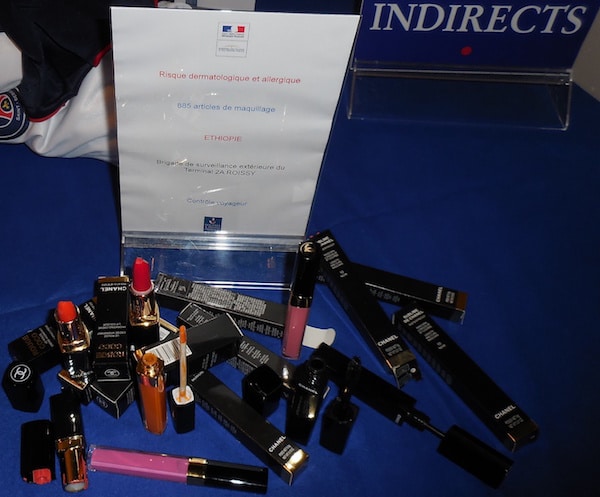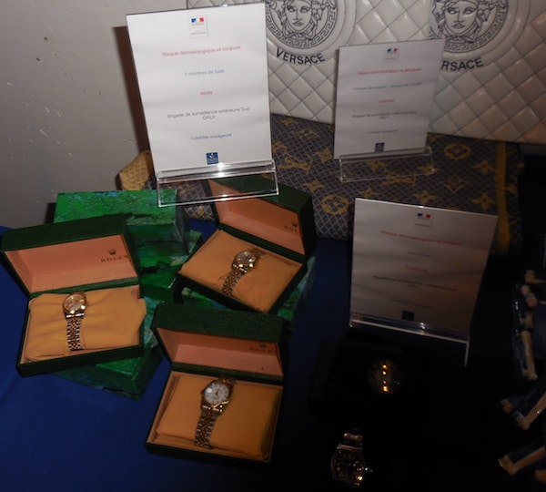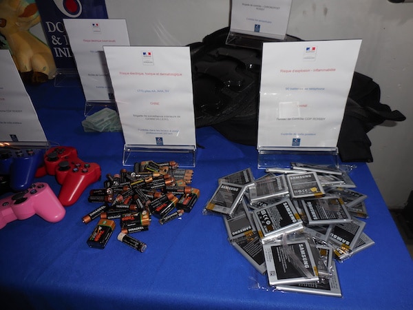Lunettes Ray-Ban, parures Gucci et Versace ou coques Samsung de Chine, rouges à lèvres Chanel venus d’Ethiopie, chaussures Ralph Lauren de Turquie, Viagra égyptien, couverts et assiettes de Limoges fabriqués en Russie ou encore montres Rolex d’Iran, des dizaines de milliers d’articles étaient présentés. Ainsi que les risques liés : plomb dans les jouets, batteries d’Iphone qui explosent, piles qui coulent, allergies causées par des bijoux ou des cosmétiques etc. Tous ces produits étaient issus de saisies pratiquées en Ile de France sur les 3 à 5 derniers mois.