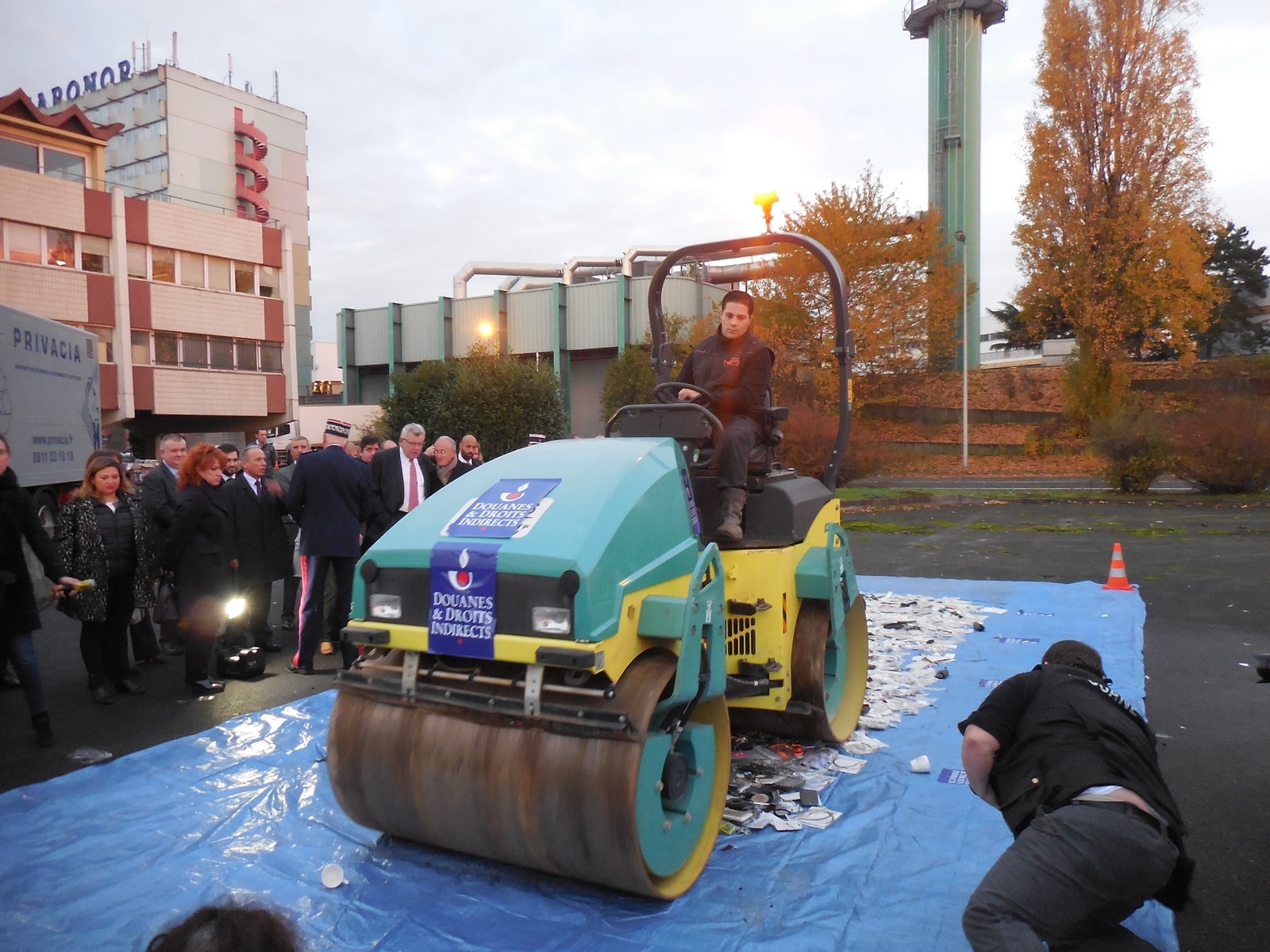 Le jour se lève à peine et le secrétaire d’État au budget arrive. Des produits de contrefaçon divers sont étalés sur une bâche et écrasés devant lui avec un rouleau compresseur estampillé aux couleurs de la douane. Le textile est empilé dans des caisses. Un camion broyeur se trouve garé tout près : pendant plusieurs heures, les agents des douanes détruiront caisse après caisse les produits contrefaits. Après que la contrefaçon ait été écrasée, le ministre se fait présenter les objets saisis par un gradé des douanes. Celui-ci lui explique que les douaniers contrôlent les colis, mais investissent aussi des entrepôts remplis de contrefaçon, notamment en région parisienne.