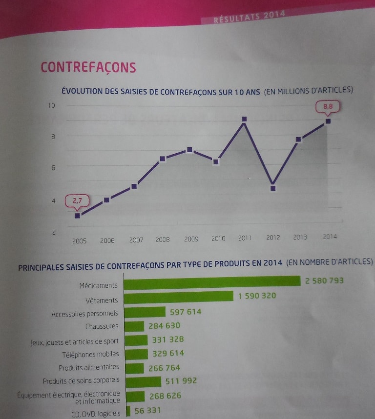 Selon les représentants de la douane, « 81% des produits dont nous arrivons à déterminer le pays de provenance viennent de Chine et de Singapour » ; 1% vient d’Afrique et 5% d’Europe. Les cigarettes – de contrebande plutôt que fausses – proviennent des pays de l’Est. Une partie du textile, de Turquie. Les médicaments, d’Inde ou du Proche Orient. Il n’y a pas toujours de danger : « Récemment, on a saisi un lot de médicaments, ils contenaient tous du sucre. Il n’y avait pas de principe actif ». Mais des saisies peuvent aussi être très dangereuses : « par exemple les bijoux en France doivent contenir moins de 0,05%. Mais on en a saisi qui sont constitué de plus de 80% de cadmium, et ça oscille souvent entre 30 et 60% de cadmium », un métal lourd toxique même à faible dose.