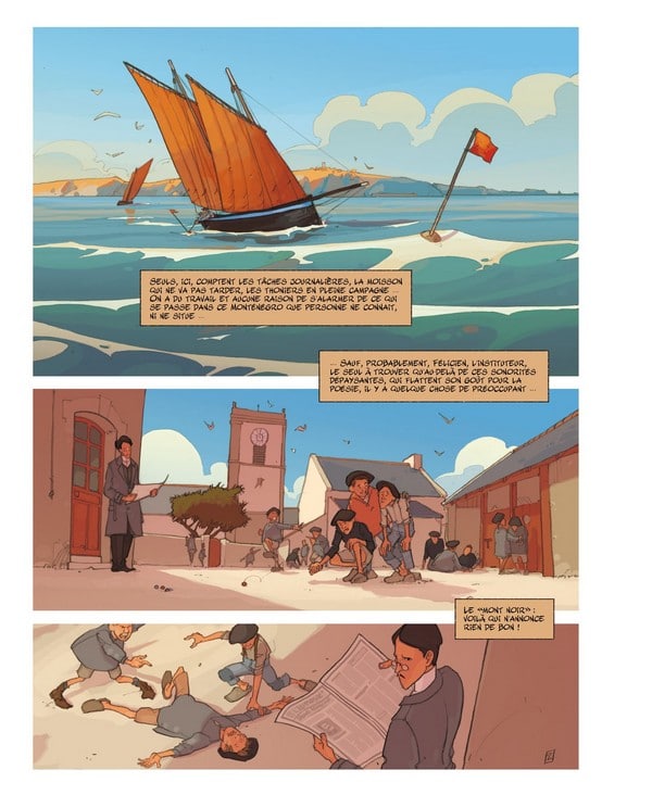 Juin 1914, sur une île bretonne. Les clochent de l’église sonnent le tocsin. La mobilisation générale est décrétée. Tous les hommes valides de l’île doivent rejoindre le continent pour aller combattre. Persuadés qu’ils seront de retour pour les moissons, ils partent sans crainte se battre. Seul l’instituteur écrit au mur du tableau « Morale du jour : aucune île n’est à l’abri des continents imbéciles ».