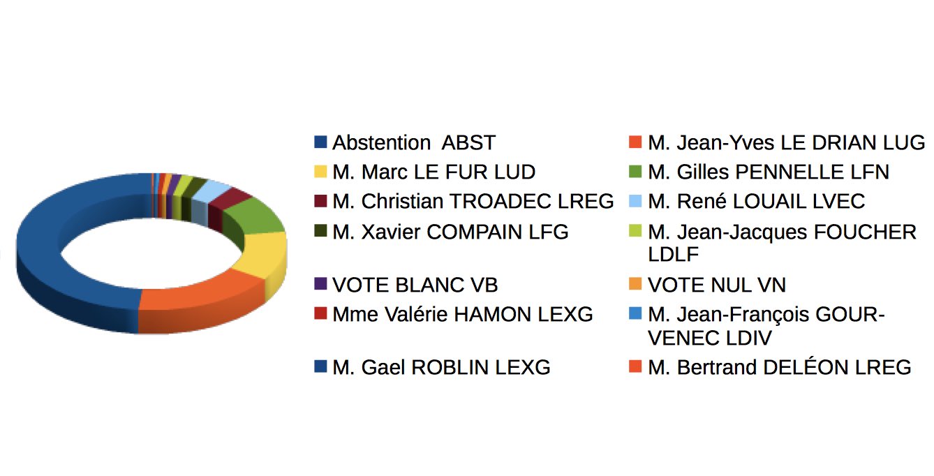 Si l’on prend en compte l’intégralité des inscrits sur les listes électorales bretonnes, soit 2 421 863 électeurs, Jean-Yves le Drian et sa liste ne séduisent que 17,34% de la population, 11,64% pour Marc le Fur (LR), 9,02% pour Gilles Pennelle (FN), et 3,33% pour Christian Troadec (REG).
