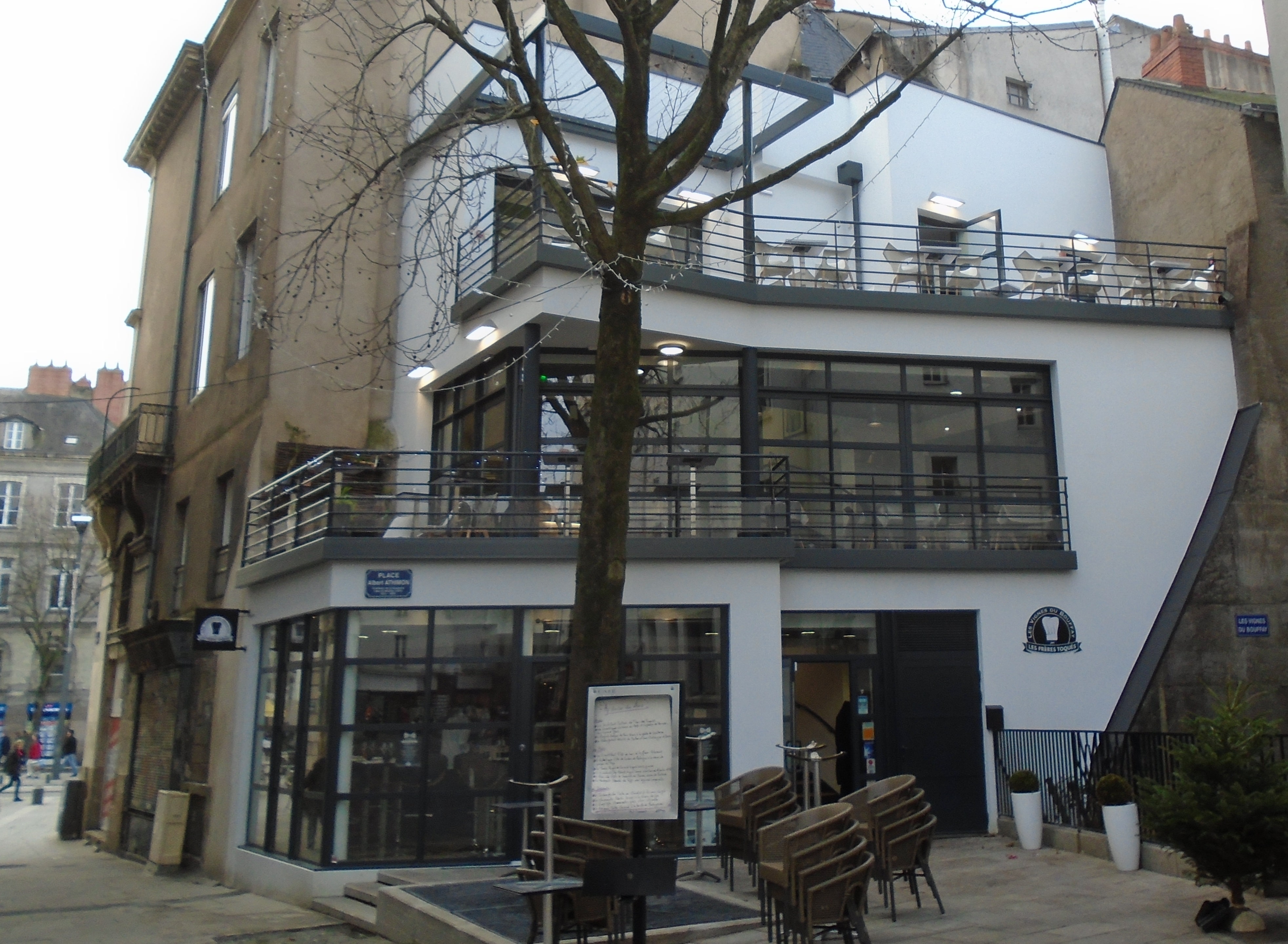 31/12/2015 – 08H00 Nantes (Breizh-info.com) ‑ À droite, les vignes du Bouffay, improbable carré viticole en plein cœur historique de Nantes ; à gauche, le siège de la Commune libre du Bouffay, pas moins improbable clique de joyeux drilles hyperlocaux ; au milieu, dressé contre un mur aveugle naguère tagué largement, un restaurant vertical d’aspect moderniste : Les Frères Toqués (clin d’œil : la décoration intérieure a été confiée à deux des ex-graffeurs). Les trois niveaux répondent à trois ambiances distinctes : déjeuner sur le pouce en bas, repas traditionnels au milieu, détente en terrasse en haut.