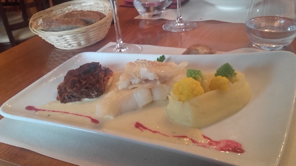 En entrée, nous avons dégusté la salade « Vents et Marées » composée de foie-gras, de magret fumé, de jambon grillé (seul bémol), de croûtons, d’oignons et de salade verte. Simple, efficace, pas trop copieux. Puis en plat principal, ce fût d’un côté un filet de flétan exquis et particulièrement frais (il fondait dans la bouche) accompagné d’une purée de pommes de terre maison et d’un feuilleté d’endives caramélisées. Un excellent plat, raffiné, frais, tout y était.
