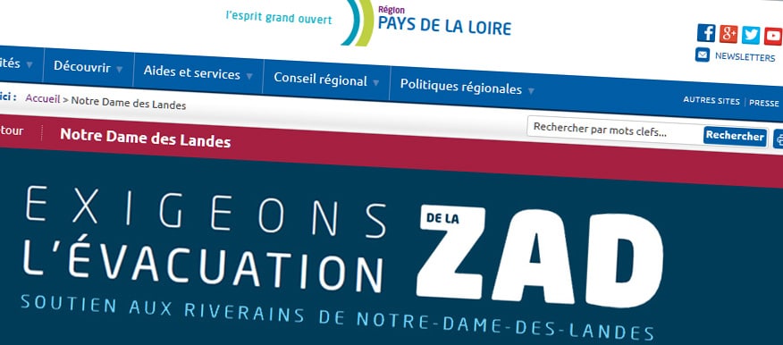 Mais son geste le plus visible est le lancement cette semaine d’une pétition intitulée « Exigeons l’évacuation de la ZAD – Soutien aux riverains de Notre-Dame-des-Landes », qui barre toute la page d’accueil du site. Là, Bruno Retailleau s’inscrit bien sûr dans la droite ligne du socialiste Jacques Auxiette, fervent partisan du projet de nouvel aéroport. On note surtout le changement de l’axe de communication : on ne réclame plus la construction de l’aéroport, qui soulève trop d’oppositions, mais l’expulsion des zadistes, beaucoup plus consensuelle.
