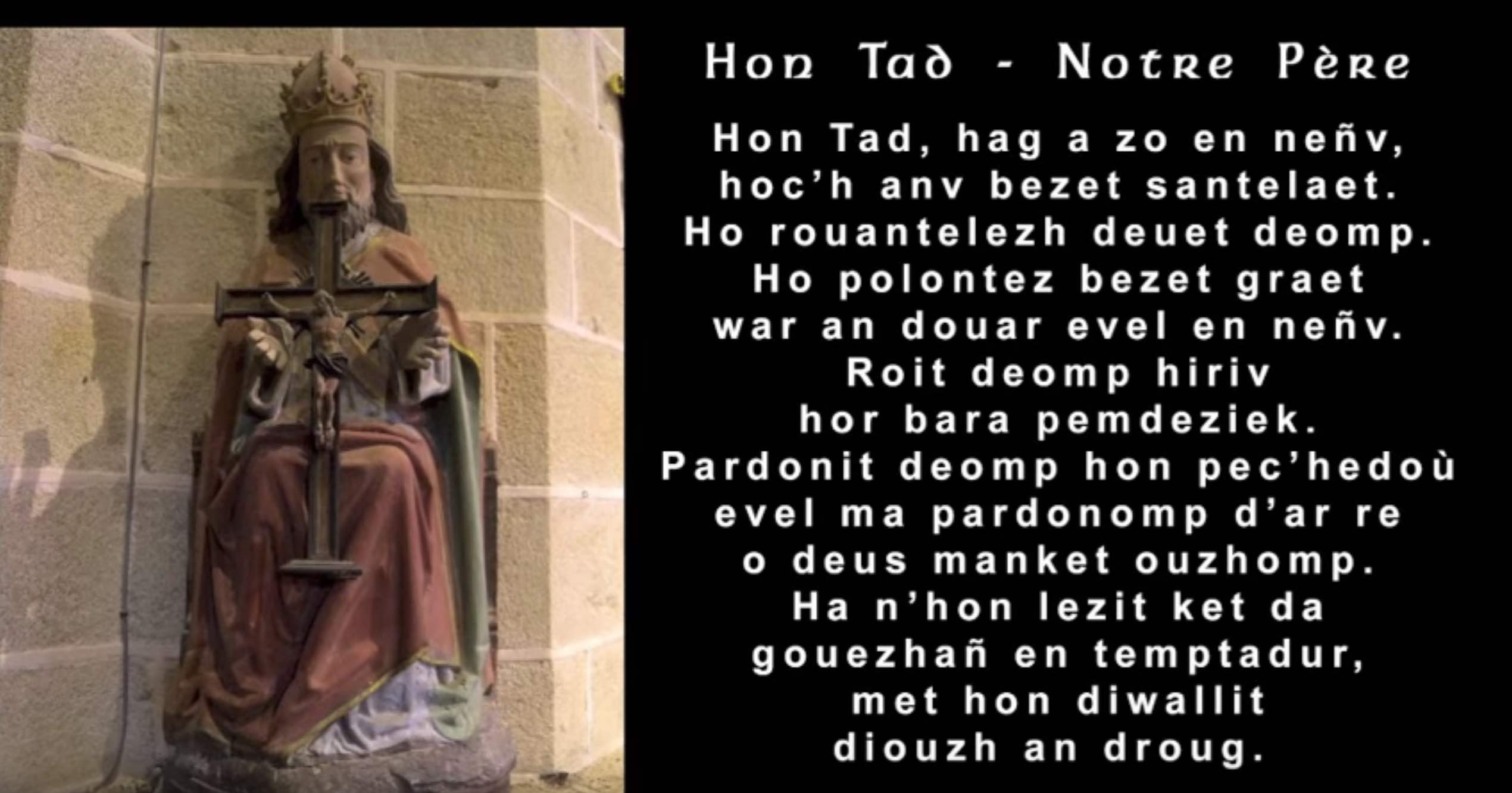 On remarque qu’en breton, Dieu est toujours vouvoyé (Hoc’h anv, votre nom), alors que, suite au Concile Vatican II, les francophones ont pris l’habitude de tutoyer Dieu dans le Notre Père depuis les années 1960.