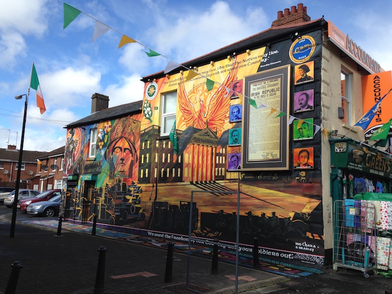 Il est à noter que plus les années passent, plus les « murals », ces fresques rendant hommage aux combattants , d’un côté comme de l’autre, évoluent. Ainsi, à l’occasion du centenaire, une fresque orangiste représentant le fondateur de l’UVF (Ulster Volonteer Force) a été érigée dans Falls Road, ce qui a provoqué sa dégradation, deux fois en une semaine. Cette fresque, fait partie d’une longue série nommée « international wall » sur laquelle on trouve pèle-mèle des hommages à Nelson Mandela, au Che Guevara, au PKK Kurde, ou encore …aux réfugiés (en Gaélique et en arabe notamment) …