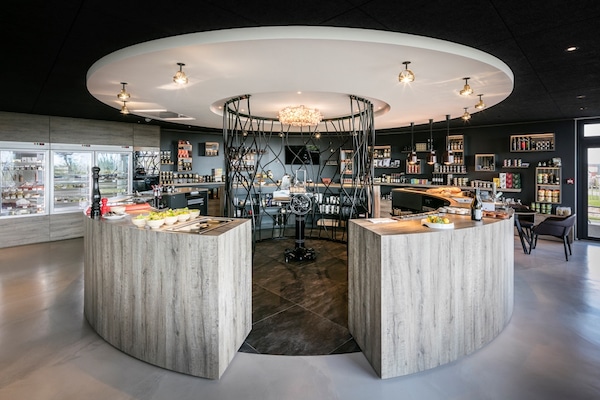 Une épicerie fine occupe le premier. Avec ses rayons de conserves, ses casiers à bouteilles, ses vitrines réfrigérées… On vient y faire ses emplettes parmi 550 références classiques de produits frais et secs, de charcuterie, de produits de la mer, de vins fins, de thé et de pâtisseries. Les clients prennent leur panier à l’entrée pour voyager dans les rayons. Direction la Bretagne, l’Italie, l’Espagne ou le Japon.