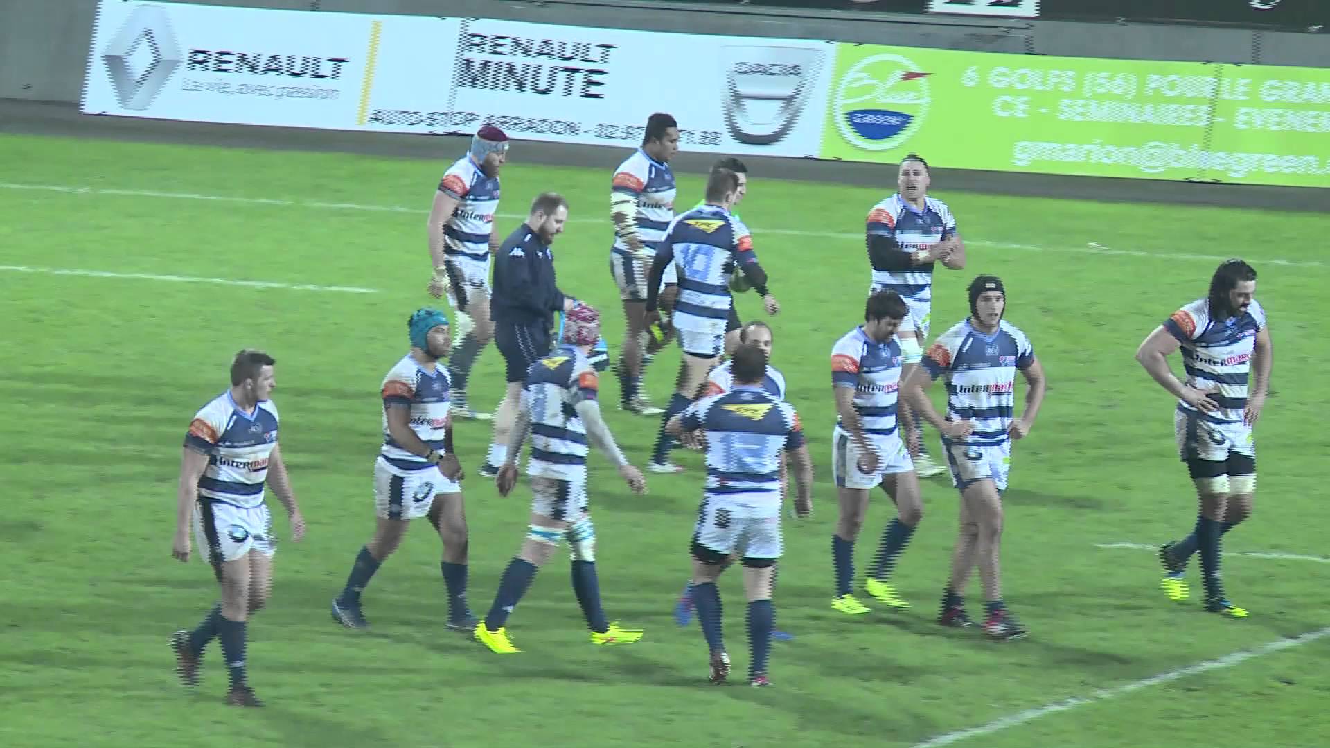 RC VANNES. 3 essais de Duplenne (26’, 69’, 80’+1), 1 transformation de Claverie (26’). 5 pénalités de Claverie (5’, 11’, 40’+6, 43’, 54’). Carton jaune : Mourot (21’).