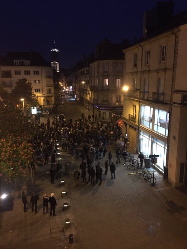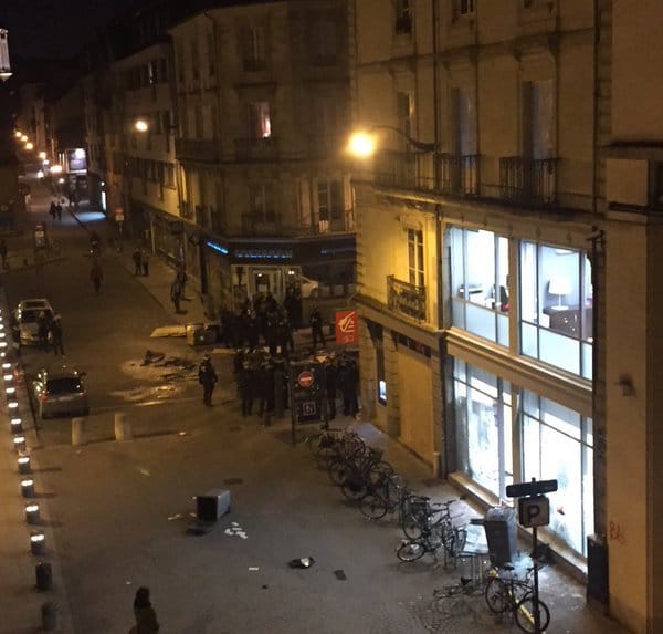 Un rassemblement pacifique était prévu à 20 h place Sainte-Anne, dans le centre de Rennes. Près de 200 activistes d’ultra-gauche y sont venus, et ont commencé par défier calmement les forces de l’ordre qui protégeaient la salle de la Cité et les empêchaient de la réinvestir. Vers 21 h 30, alors que l’attroupement – sauvage – avait grossi, les protestataires ont commencé à détruire caméras et palissades du métro, puis à jeter des projectiles sur les forces de l’ordre qui ont répliqué en gazant l’attroupement.