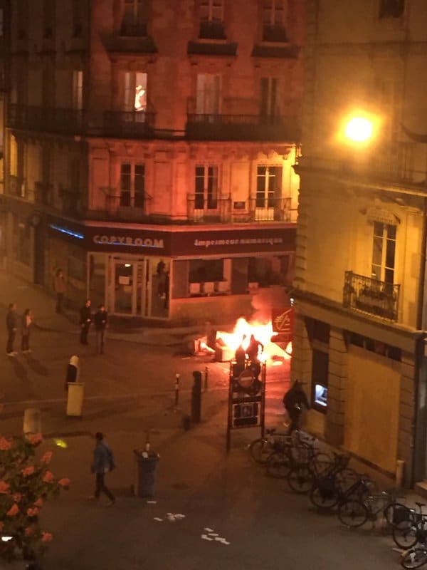 Les manifestants se sont alors dirigés vers le centre-ville où ils ont commis de nombreuses dégradations. Les vitres d’un commissariat de police rue de Penhouët ont été brisées, le local du PS a vu son rideau de fer et ses vitres détruits, des boutiques de vêtement et des banques situées notamment rue d’Orléans ont été dégradées, des palissades de bois protégeant certaines agences ont été arrachées et les vitres enfoncées à l’aide de poutres. Les locaux du Crédit Mutuel place Sainte-Anne et de la Caisse d’Epargne rue Hoche ont été saccagés, le matériel détruit, les papiers éparpillés dans la rue. Une Porsche stationnée place de la République a été incendiée – c’est déjà la seconde qui subit les foudres de l’ultra-gauche après celle qui a été incendiée le 28 avril dernier à Nantes. Cette dernière appartenait d’ailleurs non pas à un grand patron avec cigare et haut de forme, mais à un électricien de 30 ans passionné de Porsche. Des feux de poubelle ont été aussi allumés, notamment rue Hoche.