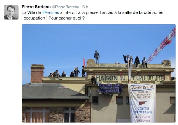 Madame Appéré, le maire socialiste de Rennes a cédé à la loi de la rue et à la violence aveugle de l’extrême-gauche. Elle a autorisé la présence des squatteurs jusqu’au 16 mai. Ceux-ci ont vite fait de transformer les lieux en camp de base. Ils ont tagué largement les murs extérieurs. Ils ont détruit l’enseigne sur le porche. Ils ont investi les toits. Ils ont aussi fait des abords une zone de non-droit où ont notamment été tabassés le responsable et le responsable adjoint de l’UNI (syndicat étudiant classé à droite) en Bretagne administrative, coupables de dénoncer sans relâche les multiples dégradations que l’ultra-gauche fait subir aux facultés et au centre-ville rennais depuis des mois.