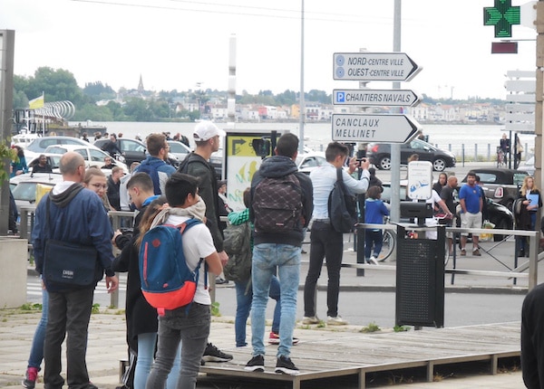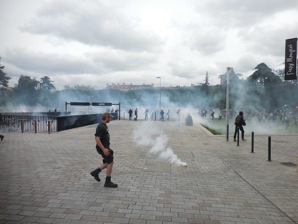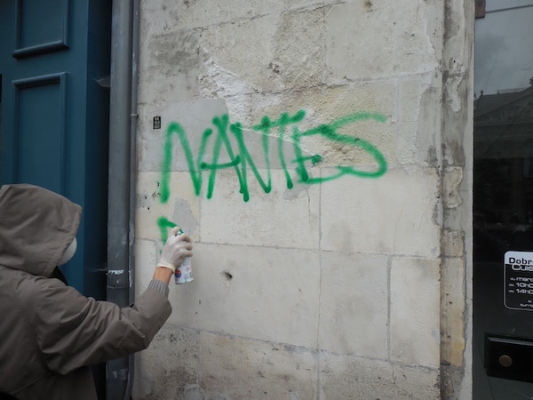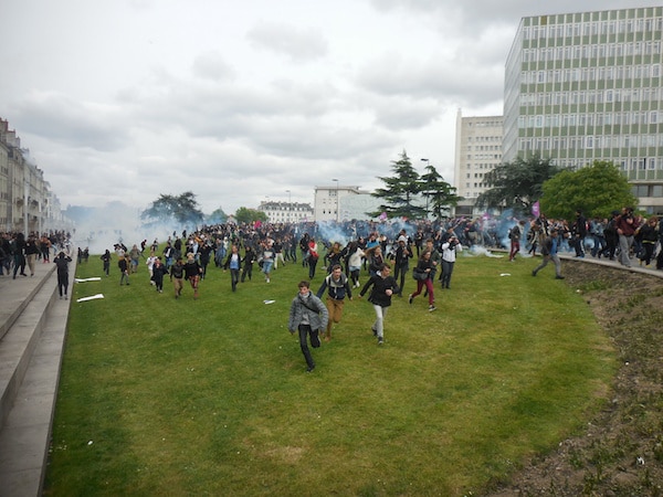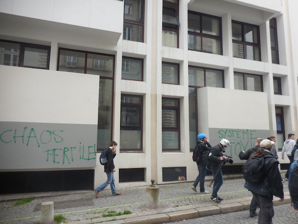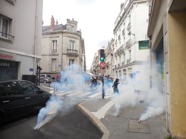Néanmoins à 15 heures un fort parti de près de 1 500 personnes s’est rassemblé sur le miroir d’eau, certains syndicalistes étant présents – Sud Solidaires avait notamment appelé à la manif, bien qu’elle fût interdite. A 15 h 20, le cortège, qui se dirigeait vers la gare, se rendit au bas du cours Saint-Pierre, où les policiers furent pris à partie et répondirent en gazant. A 16 h 03, la manifestation était revenue place Neptune, à la pointe est de l’île Feydeau, à 16 h 18, elle était place de la Petite Hollande. Entre-temps, la BAC, qui progressait au rythme des petites charges des gendarmes mobiles, se faisait caillasser à 16 h 10 rue Kervégan. A 16 h 23, tandis qu’une partie des manifestants se dispersaient sous une pluie de grenades lacrymogènes, d’autres se faisaient gazer contre la passerelle menant au tribunal et la Médiathèque, et montaient se réfugier dans les rues du quartier Graslin. Au passage, l’arrière de la Médiathèque était tagué, avec des inscriptions comme « chaos fertile » et « système toxique ».