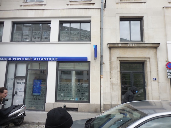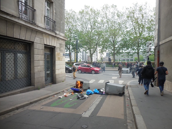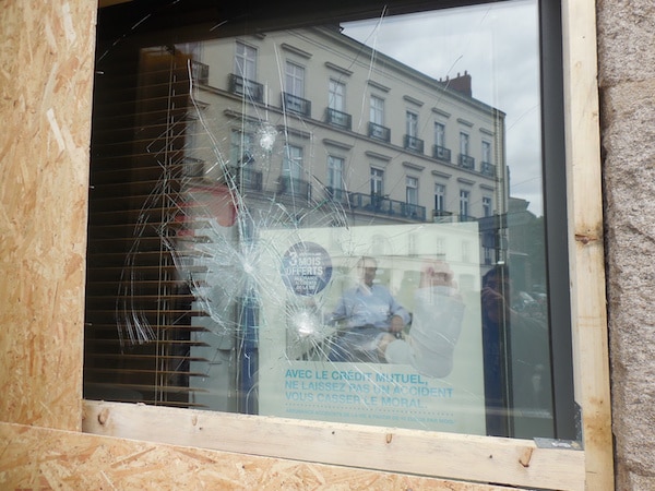 Deux minutes plus tard, des jeunes casseurs arrachaient les palissades qui protégeaient le Crédit Mutuel place Dobrée et caillassaient plusieurs vitres. Le panneau publicitaire sur la place était lui aussi fracassé et sa publicité déchirée. Pressée par les policiers qui barraient les débouchés sur la rue Copernic au nord et la place Graslin au sud, la manifestation – qui n’était plus composée que de 600 à 700 manifestants, refluait sur la place Ladmirault, où la vitrine de la Banque Populaire fut caillassée. Enfouie au cœur du quartier bourgeois de Graslin, à l’écart des grands axes, c’était la seule des agences nantaises de la banque à ne pas avoir été protégée par des contreplaqués. Juste à côté, des manifestants ont descellé des plaques de contreplaqué sur le Crédit Agricole, et caillassé certaines vitres. Pressé par la police, le cortège refluait dans un certain désordre place de la Monnaie. A 16 h 49, des casseurs mettaient le feu à des poubelles à l’angle de la rue Montesquieu et de la place de la Monnaie, des riverains et notre reporter ont réussi à les éteindre avant que le feu ne se propage. Pendant ce temps, le cortège passait si vite rue Athénas, pour rejoindre la rue Voltaire et mettre du champ entre eux et les policiers, que la librairie Dobrée, pourtant ouverte n’a pas reçu un seul projectile. Vers 16 h 53, les manifestants ont réussi leur pari, en redescendant sur les quais par la rue de Flandres Dunkerque, au pas de course. Bien que des CRS, arrivés par la rue de Bréa, aient gazé le cortège et coupé le tiers supérieur, celui-ci est arrivé sur les quais par la rue parallèle de la Verrerie. En bas de la rue Flandres Dunkerque 40, deux poubelles sont à nouveau embrasées, et une balancée sur le quai de la Fosse.
