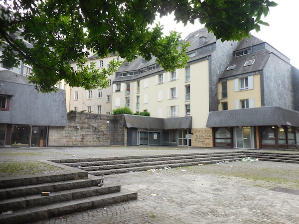Place Sainte-Anne, ce n’est pas mieux. Tous les abords de la salle de la Cité sont largement dégradés. L’extrême-gauche l’avait occupée douze jours durant début mai et l’avait laissée dans un état catastrophique ; elle a été murée. Avec le jeu de Paume en friche juste à côté, c’est une blessure ouverte dans le tissu urbain du cœur de Rennes.