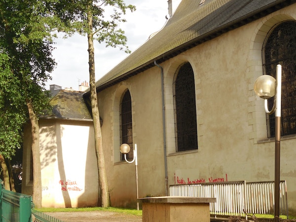 Il n’y a plus qu’une messe par semaine le dimanche, et quelques cérémonies. Le reste du temps l’église est vide, aucune paroisse n’y a son siège. Aucune voix ne s’élève pour la défendre, alors qu’elle est plutôt en bon état. Mais ses abords le sont nettement moins. Sur le carrefour Juaust, face à sa façade, canettes, bouteilles de bière vides et boîtes de kebab s’amoncèlent tristement au bas des marches. Un mur est défiguré par un tag qui rappelle la fréquence de la radio pirate installée par les occupants de la salle de la Cité, il y a un mois. Et sur l’église même, les tags anarchiste « Ni dieu ni maître » et « hasta la victorie siempre » y sont depuis plus d’un mois. Comme si c’était normal.