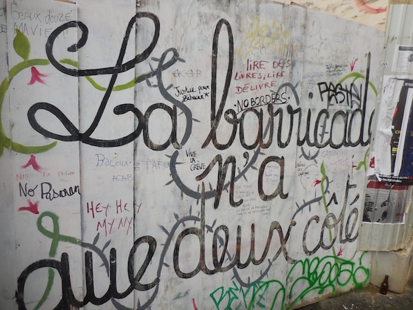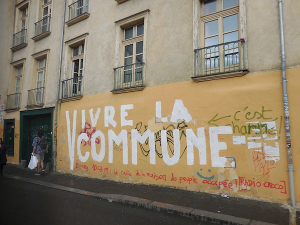 « Vivre la commune, c’est chanmé », nous apprennent des tags au bas d’un immeuble du XVIIIe qui aurait besoin d’un bon ravalement, mais était plutôt en bon état avant le passage des artistes peintres. « Je veux vivre de grève si vivre c’est travailler », proclame un autre, peint sans doute par des gens qui vivent, mais qui ignorent le travail.