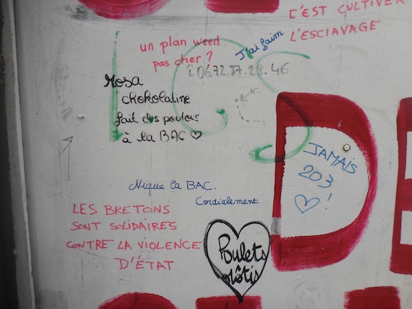 Au milieu, des petits tags insultent la police, proposent des stupéfiants – avec le numéro de téléphone du dealer – ou critiquent le système. Deux sont particulièrement révélateurs : « qui ne se plante jamais n’a aucune chance de pousser », et « bac mention violence policières ».