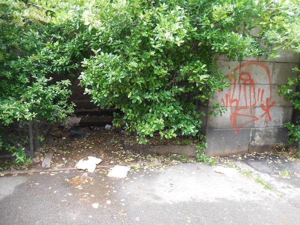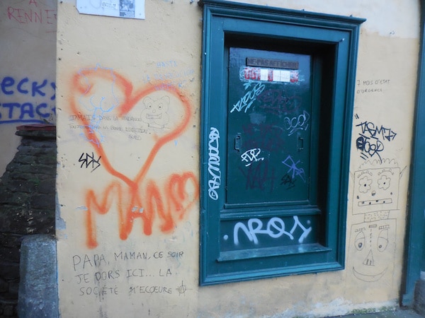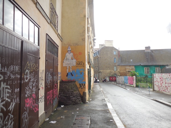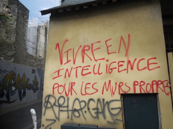 Un grand tag détourne le slogan de la ville de Rennes depuis 1993 : « vivre en intelligence pour les murs propres ». Beaucoup d’inscriptions ne veulent rien dire, ou sont juste les signatures d’egos ravageurs en mal de reconnaissance. Une bourse aux vices du quotidien rennais, à deux pas des montagnes de boîtes à kebabs qui émergent des fourrés pas du tout entretenus qui flanquent l’église Saint-Aubin de tous côtés.