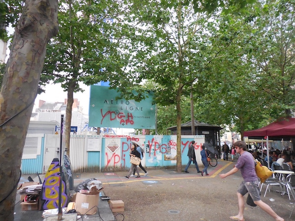 Les tags sont partout. Sur les barrières dressées autour de la salle pour empêcher qu’elle ne soit réoccupée. Sur les rez-de-chaussée des immeubles. Par terre. Sur les panneaux de chantier du métro : là encore, il y a un grand trou devant Saint-Aubin. Si les shadoks pompaient sans relâche, les pouvoirs publics rennais creusent sans relâche, dans l’espoir sans cesse déçu de trouver un jour du pétrole pour rentabiliser le métro.