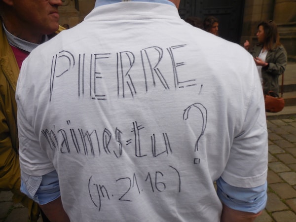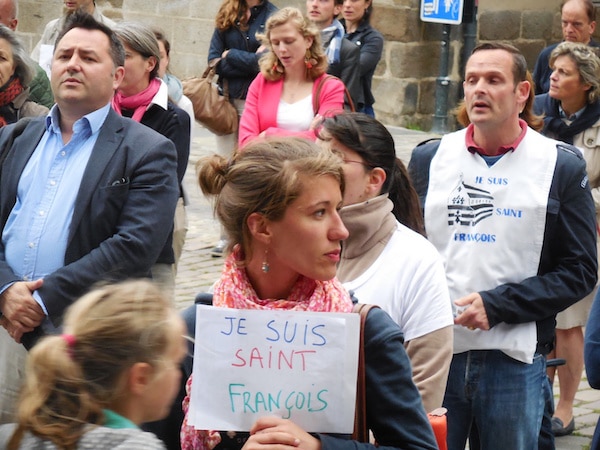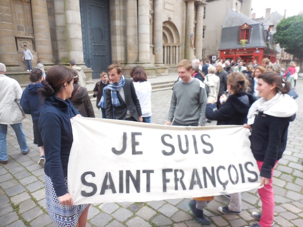 Plus de 150 fidèles se sont réunis devant la Cathédrale entre 19 heures et 20 h 30 pour dire un chapelet ; certains portaient des pancartes ou des T-shirts « Je suis Saint-François », ou « Pierre, m’aimes-tu », une interpellation que fait le Christ à l’apôtre Pierre dans l’Evangile. Parmi eux, de nombreux jeunes issus des quatre coins du département de l’Ille-et-Vilaine, témoins de l’attractivité d’une communauté traditionnelle qui fournit à l’Eglise plusieurs vocations sacerdotales par an, dirigées vers le séminaire de l’ICRSP à Gricigliano, en Italie, et non le séminaire inter-diocésain de Rennes. A l’issue, Hubert des Minières annonce la couleur : « nous sommes déterminés, on va renouveler et continuer ce genre d’actions ».