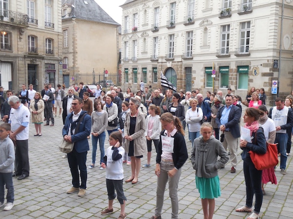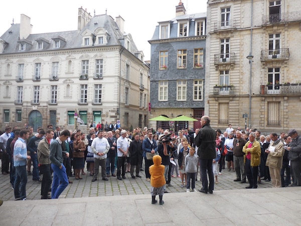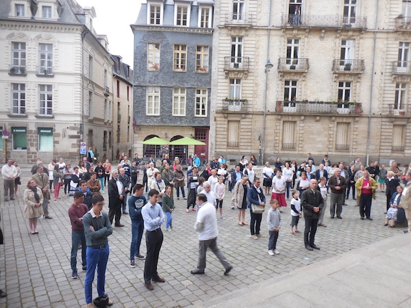 01/07/2016 – 11H30 Rennes (Breizh-info.com) –Les fidèles de la communauté traditionnelle de la chapelle Saint-François à Rennes, dont l’archevêque Mgr d’Ornellas essaie de précipiter la fin en rompant la convention entre le diocèse et l’Institut du Christ Roi Souverain Prêtre (ICRSP) qui dessert la chapelle, sont allés prier publiquement devant la cathédrale de Rennes ce mercredi 29 juin. Une façon de fêter la Saint-Pierre, de souhaiter sa fête à l’évêque, Mgr Pierre d’Ornellas, et de montrer leur détermination.