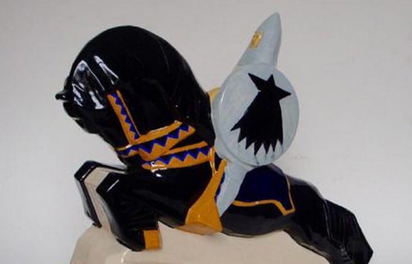 On remarque particulièrement une rare statuette de René Yves Creston représentant Nominoë en armure et  plusieurs plaques et plats vernissés signés d’Alfred Beau. Notons aussi un rare groupe en faïence polychrome, représentant deux couples Bourleden en danse, de Robert Micheau-Vernez, Manufacture HENRIOT, vers 1940 (2500/3000€)