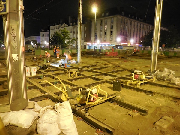 21/07/2016 – 06H45 Nantes (Breizh-info.com) – Depuis le début de l’été, le cœur de Nantes, près de la Place du Commerce, est transformé en ruche vibrionnante. Près de cent ouvriers – accompagnés de 20 à 30 personnels d’encadrement – travaillent jour et nuit sur le chantier de l’amélioration du cœur du réseau du tramway, des stations Commerce sur les lignes 1 et 2-3 aux caténaires, en passant par la réfection des rails, des aiguillages et de la signalisation.