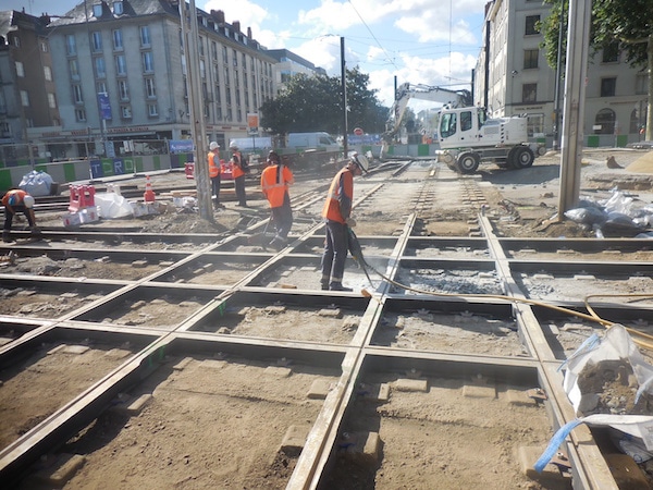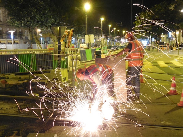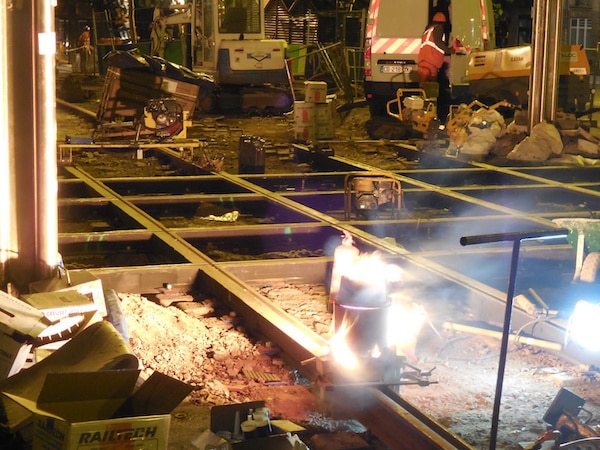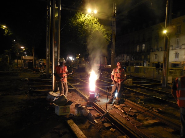 les soudeurs utilisent pour cela des creusets jetables, sortes de haut-fourneaux miniatures. Le surplus de soudure est ensuite enlevé à la meuleuse. La nuit, c’est particulièrement impressionnant : sur le chantier éclairé à giorno, au milieu des rails déposés (en vrac) et des rails nouveaux alignés au carré – même quand ils sont en courbe – des gerbes d’étincelles illuminent le cœur de Nantes ça et là. C’est la naissance, au milieu du vacarme, du tramway nouveau.