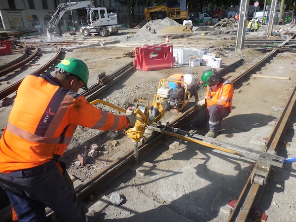 Pour finir dans les délais, le chantier ne s’arrête ni le jour ni la nuit. Tout le long de la journée, des ouvriers creusent, posent des câbles, enterrent, coupent – à la tronçonneuse s’il faut faire une coupure soignée, au chalumeau si elle est provisoire – ou soudent. Les soudures se font par aluminothermie, comme c’est fait sur les lignes à grande vitesse ;