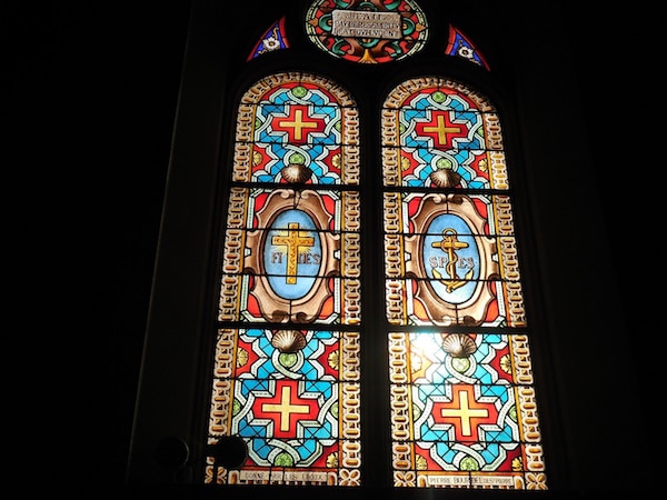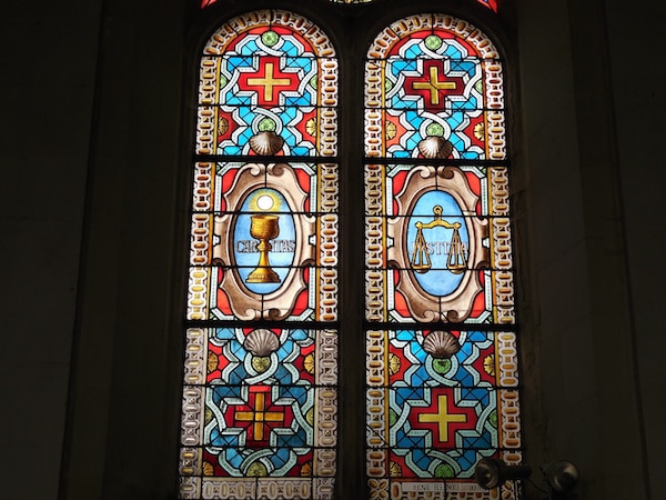 Par ailleurs, si les verrières du choeur représentent plusieurs saints, dont saint Augustin, sainte Gertrude, sainte Germaine, saint Henry, et que celles des transepts sont dédiées à la Vierge et au Sacré Coeur, elles sont complétées par deux verrières intéressantes. Celles-ci représentent les trois grandes vertus catholiques, avec leurs symboles. La Foi et sa croix d’or, la Foi et son ancre – car Saint Paul disait dans l’épitre aux hébreux « Nous avons cette espérance comme une ancre pour l’âme, ferme et sûre », et elle représente la fermeté dans la tempête – la charité et son calice, au-dessus duquel rayonne l’hostie. Ces vertus sont complétées par la balance de la Justice, une des quatre vertus cardinales (avec le courage, la tempérance et la prudence)