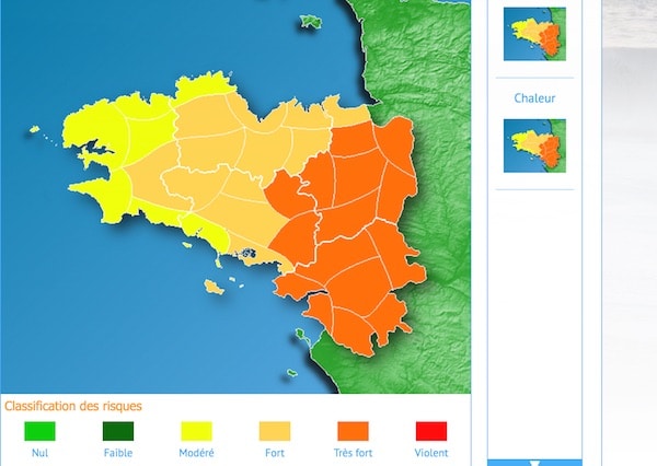 Sur les zones en ORANGE, on attend une poursuite des fortes chaleurs mercredi, jeudi, vendredi et samedi. A Ancenis, Vitré et Nantes, les températures maximales devraient dépasser les 35°C sur toute cette période. Il conviendra d’être particulièrement attentif. Sur les zones en BEIGE, les températures devraient localement dépasser les 35°C mais pas durant plusieurs jours consécutifs.