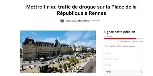 Une pétition a récemment été lancée sur Change.org, pétition qui réclame « la fin du trafic de drogue sur la place de la République, à Rennes ». « Les Rennais sont tristement spectateurs d’un trafic de drogues très actif sur la place de la république et sous les arcades de la poste depuis plusieurs années par deux bandes organisées et ennemies. », explique son rédacteur.
