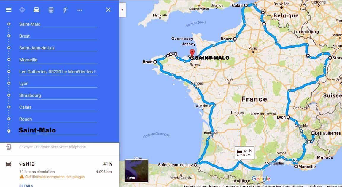 Je suis parti juste après un camp scout de 3 semaines : le dimanche 7 août au soir, je dressais une petite liste des lieux qu’il pouvait être intéressant de visiter. J’ai donc effectué un « tour » de France au sens propre : je suis parti de St Malo en direction de Brest et j’ai fait un tour de la Bretagne ; je suis ensuite descendu dans le sud-ouest jusqu’à Saint-Jean-de-Luz, puis Toulouse, Carcassonne, Nîmes, Marseille, Gap, dans les Alpes… En passant par Grenoble et Dijon j’ai ensuite atteint Strasbourg, puis Reims, Lille, Calais pour redescendre ensuite jusqu’à St-Malo. Cela fait environ 4100 km d’auto-stop en 12 jours.