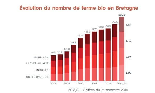 Source Bretagne : Observatoire de la production bio en Bretagne, chiffres au 30/06/2016, actualisation au 04/07/2016 .