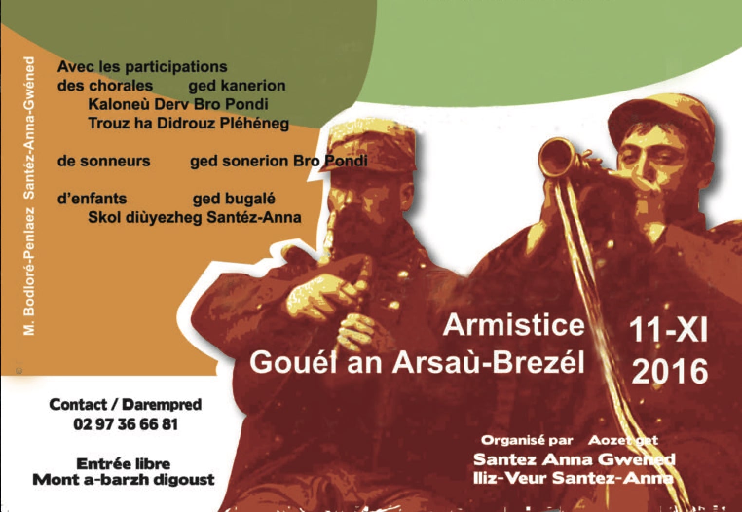 L’Association Santez Anna Gwened et la basilique de Sainte Anne d’Auray organisent de 15h à 17h une veillée-concert commémorative en breton (avec traduction) à la mémoire des Bretons morts pour la France pendant la Grande Guerre, avec la participation des Kaloneù Derv Bro Pondi et Trouz & Didrouz (Plouhinec), de sonneurs, d’enfants de l’école bilingue de Sainte Anne d’Auray.