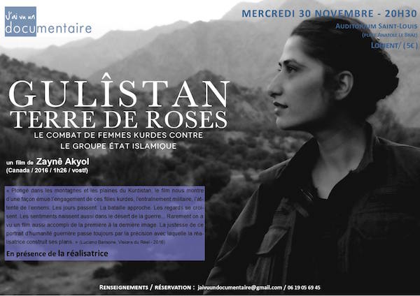 29/11/2016 – 16H00 Lorient (Breizh-info.com) – L’association J’ai Vu Un Documentaire projettera le film « Gullistan, terre de roses », mercredi 30 novembre à Lorient. Ce film de Zaynê Akyol retrace le combat des femmes kurdes contre l’Etat islamique. La projection aura lieu à l’auditorium Saint-Louis, à 20h30. (Paf : 5 €).