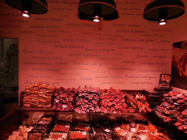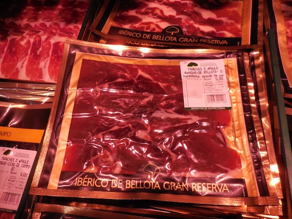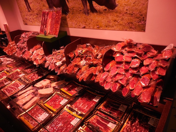 La boutique propose tous les produits issus du cochon : jambons, viandes, charcuteries découpées et conditionnées sous vide, torreznos (grattons), saucisson pour l’apéro, vin rouge de la Rioja (Bodegas Ramon Bilbao), huile d’olive etc. Il y a aussi des jambons entiers : compter entre 300 et 700 euros pour un jambon entier ; l’un de ceux qui sont pendus vaut plus de 1000 euros. On peut aussi en avoir à la coupe pour 15 à 30 euros. Pour les petites faims, il y a des sandwiches et des tourtes au jambon espagnol. Et pour Noël, « on fait des coffrets qu’on peut remplir comme le veut le client, avec du paté, de l’huile d’olive, du jambon à la coupe etc. pour 50 € environ ».