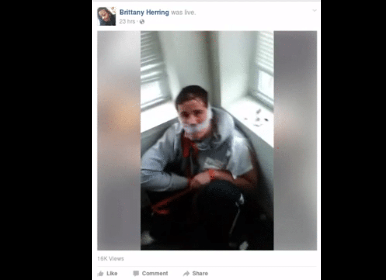 C’est par un direct Facebook que tout a commencé. Mise en ligne par Brittany Herring, la vidéo de 30 minutes met en spectacle de manière terrifiante les violences commises contre un homme, bâillonné, prostré dans un coin d’un appartement de la ville.